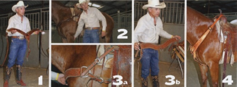 Fotos 3a e 3b – Este tipo de peitoral é usado por laçadores. Ele tem dois pares de tiras, um que passa pelas argolas em D da sela, e outro que passa pelo argolão onde se aperta a barrigueira. Isto mantém o peitoral no lugar mesmo quando ele recebe tração.
