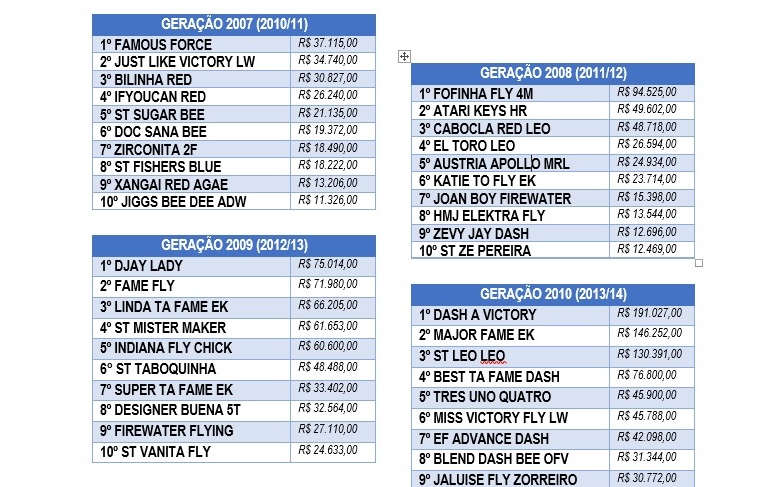 Essa premiação subiu para quase R$ 2,5 milhões para os potros de geração 2013! Esse aumento reflete muito no mercado. A tabela e o gráfico abaixo, mostram a evolução da premiação exclusiva para potros nesse período (SGP Sistema).