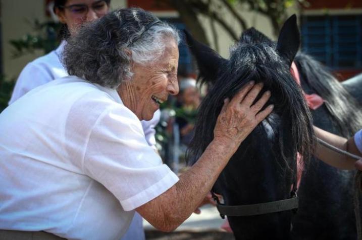 Em pleno domingo, no dia 16 de junho, o lar de idosos Gustavo Nordlund, localizado em Porto Alegre/RS, recebeu visitas mais que especiais. O cavalo da raça Crioula, chamado de Pipoca, e seis cachorros levaram alegria e descontração. Tudo graças ao projeto de extensão Pet Terapia: Terapia Assistida por Animais Desencadeando Bem-Estar, que é promovido pelos cursos da área de Saúde da UniRitter.