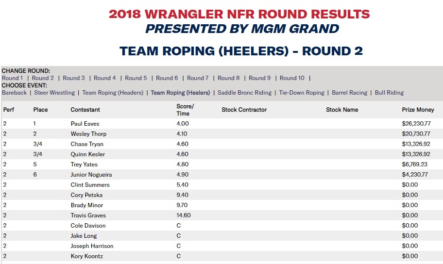 O resultado da segunda noite no Team Roping mostra que teremos uma semana longa e tensa pela frente. Depois que Junior Nogueira abriu vantagem sobre o segundo colocado no primeiro round, Paul Eaves foi lá e fez a melhor da noite na segunda rodada. Com um tempo de 4s0 no Laço Pé o maior adversário do brasileiro pontuou bem.