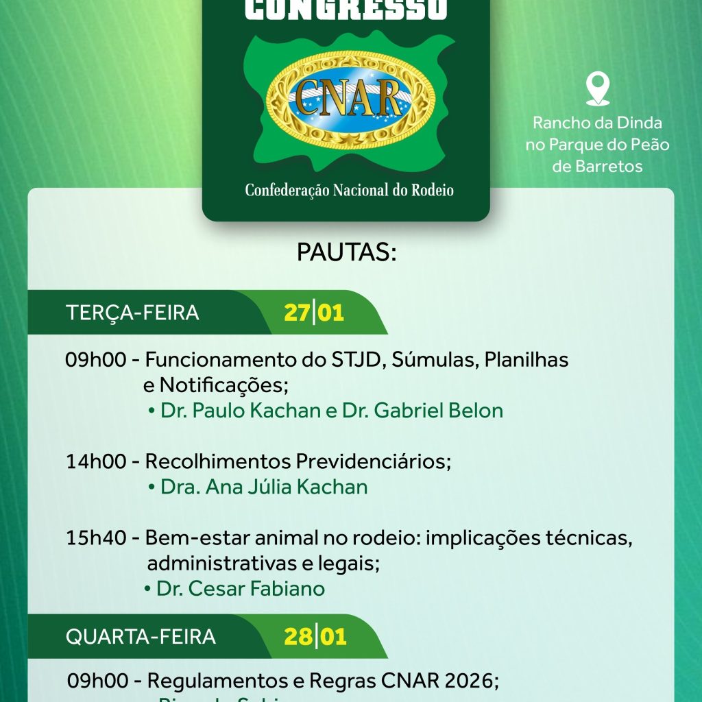 Ao sediar o congresso, o Parque do Peão de Barretos reafirma sua posição como referência no cenário do rodeio brasileiro, enquanto a CNAR reforça seu papel institucional de orientar, regulamentar e promover o desenvolvimento sustentável da modalidade, conciliando tradição, profissionalismo e responsabilidade com o bem-estar animal.