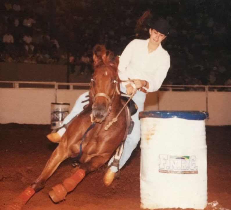 O rodeio faz parte de sua vida desde que começou a praticar os Três Tambores. E vamos combinar, não é todo mundo que tem a honra de ser pedida em casamento e ficar noiva no Rodeio de Barretos, né? Foi em 2005, quando ela saiu da arena campeã nacional pela Associação Nacional de Três Tambores. Seu namorado na época, também tinha sido campeão do rodeio internacional de Barretos. Morando fora do Brasil por mais de dez anos, sua história se funde com uma época importante do rodeio no Brasil.