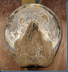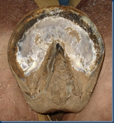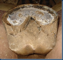 Nesta visão do casco podemos apreciar onde vamos a começar a cortar o casco com a torques, seguindo o excesso do casco ou muralha deixando equilibrado os talões. Na foto que segue vamos ver o casco depois de aparado de uma maneira equilibrada.